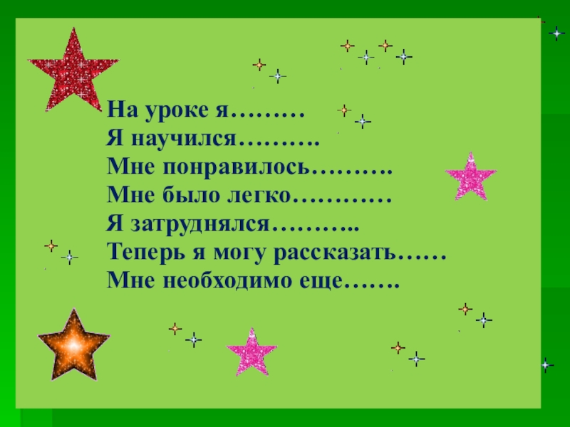 На уроке я………Я научился……….Мне понравилось……….Мне было легко…………Я затруднялся………..Теперь я могу рассказать……Мне необходимо еще…….