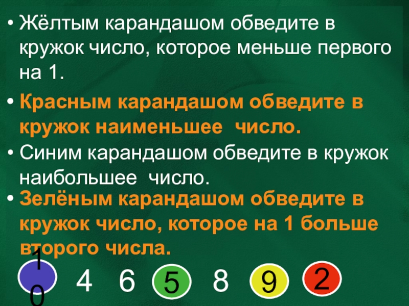 Зелёным карандашом обведите в кружок число, которое на 1 больше второго числа.