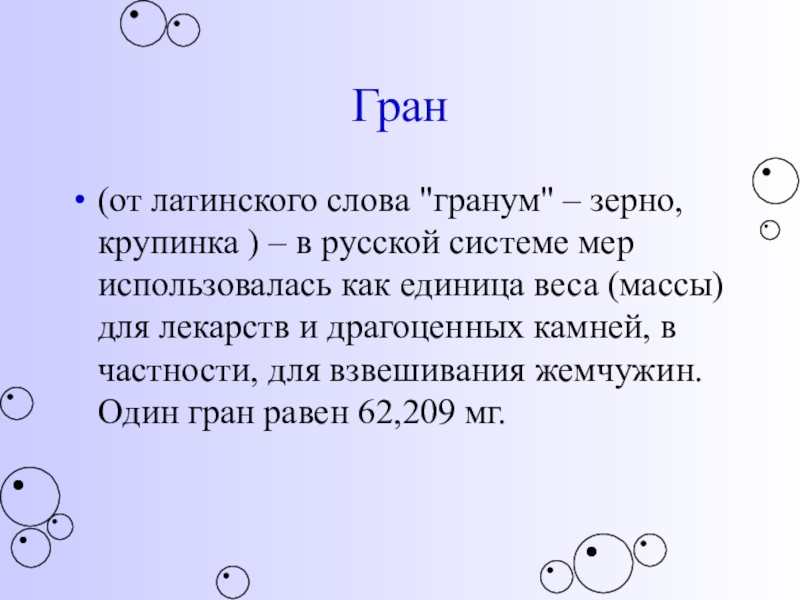 системе мер использовалась как единица веса (массы) для лекарств и драгоценных камней, в частности, для взвешивания жемчужин. Один гран равен 62,209 мг.