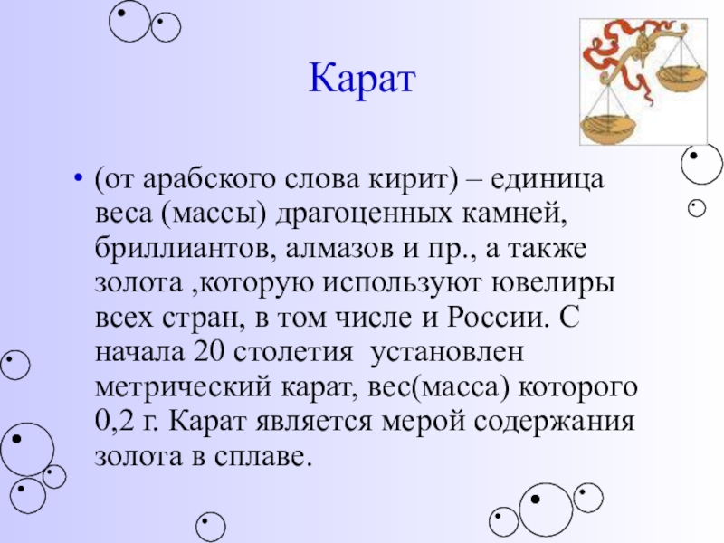 алмазов и пр., а также золота ,которую используют ювелиры всех стран, в том числе и России. С начала 20 столетия установлен метрический карат, вес(масса) которого 0,2 г. Карат является мерой содержания золота в сплаве.