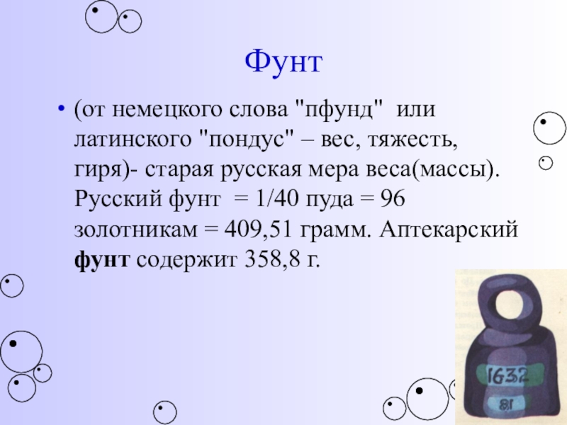 старая русская мера веса(массы). Русский фунт = 1/40 пуда = 96 золотникам = 409,51 грамм. Аптекарский фунт содержит 358,8 г.