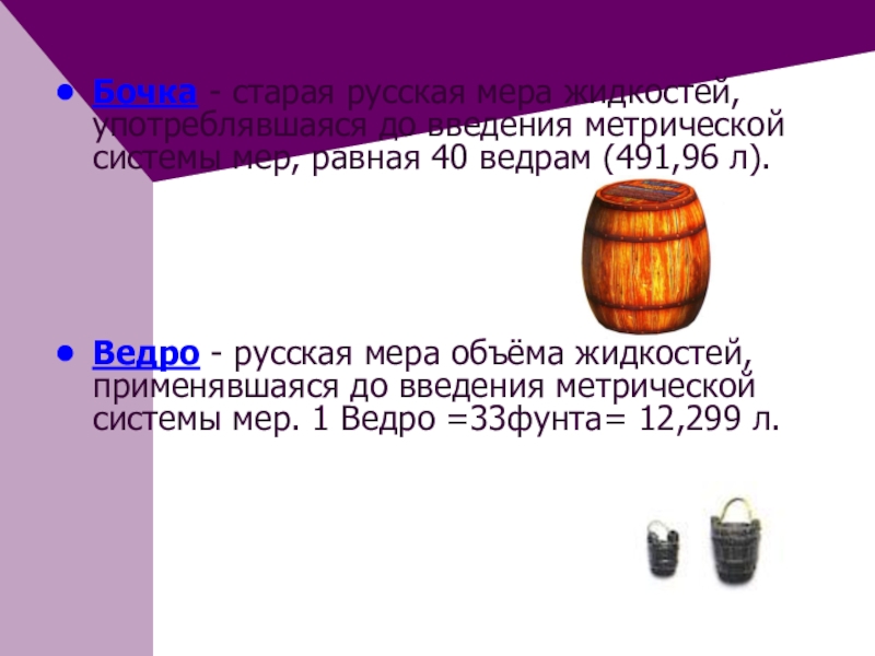 Слайд 22Бочка - старая русская мера жидкостей, употреблявшаяся до введения метрической системы