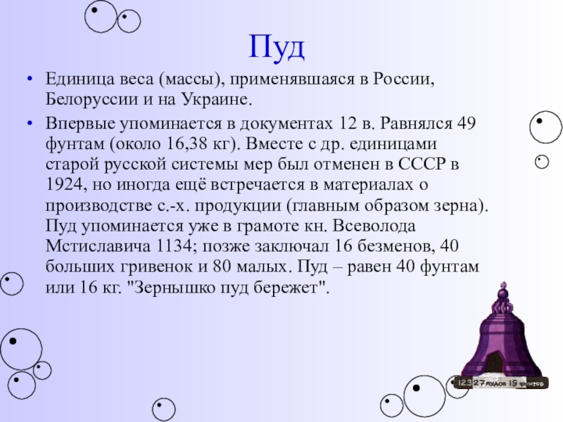 упоминается в документах 12 в. Равнялся 49 фунтам (около 16,38 кг). Вместе с др. единицами старой русской системы мер был отменен в СССР в 1924, но иногда ещё встречается в материалах о производстве с.-х. продукции (главным образом зерна). Пуд упоминается уже в грамоте кн. Всеволода Мстиславича 1134; позже заключал 16 безменов, 40 больших гривенок и 80 малых. Пуд – равен 40 фунтам или 16 кг. "Зернышко пуд бережет".