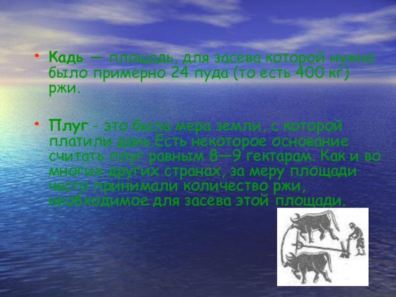 Слайд 26Кадь — площадь, для засева которой нужно было примерно 24 пуда
