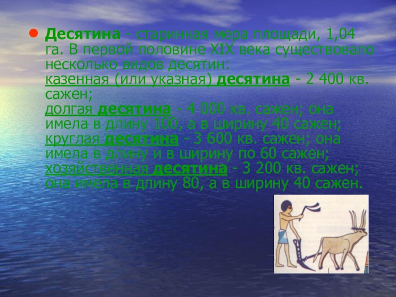 Слайд 25Десятина - старинная мера площади, 1,04 га. В первой половине XIX