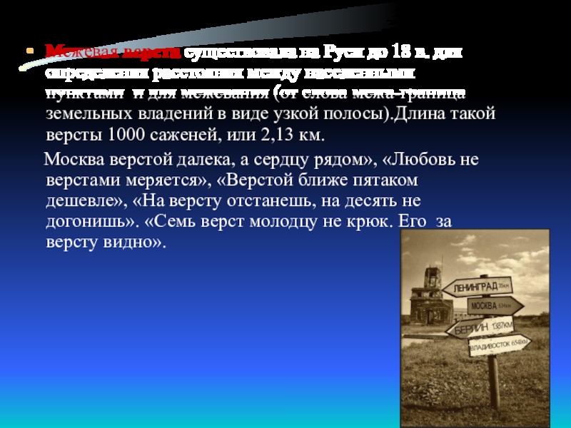 Слайд 6Межевая верста существовала на Руси до 18 в. для определения расстояния