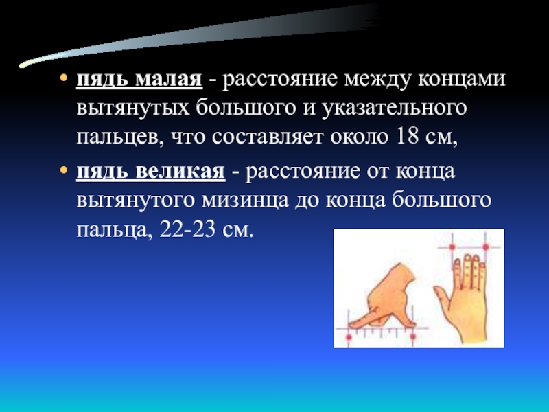 Слайд 13пядь малая - расстояние между концами вытянутых большого и указательного пальцев,