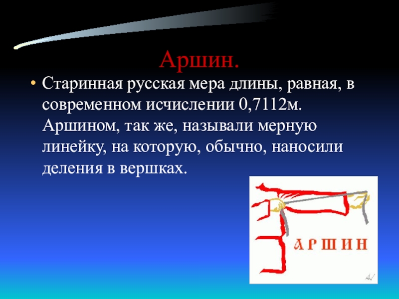 Слайд 10 Аршин -одна из главных русских мер длины, использовалась с XVI