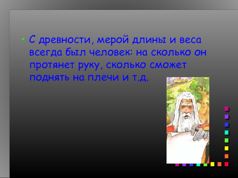 Слайд 2С древности, мерой длины и веса всегда был человек: на сколько