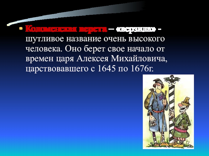 Слайд 5Коломенская верста – «верзила» -шутливое название очень высокого человека. Оно берет