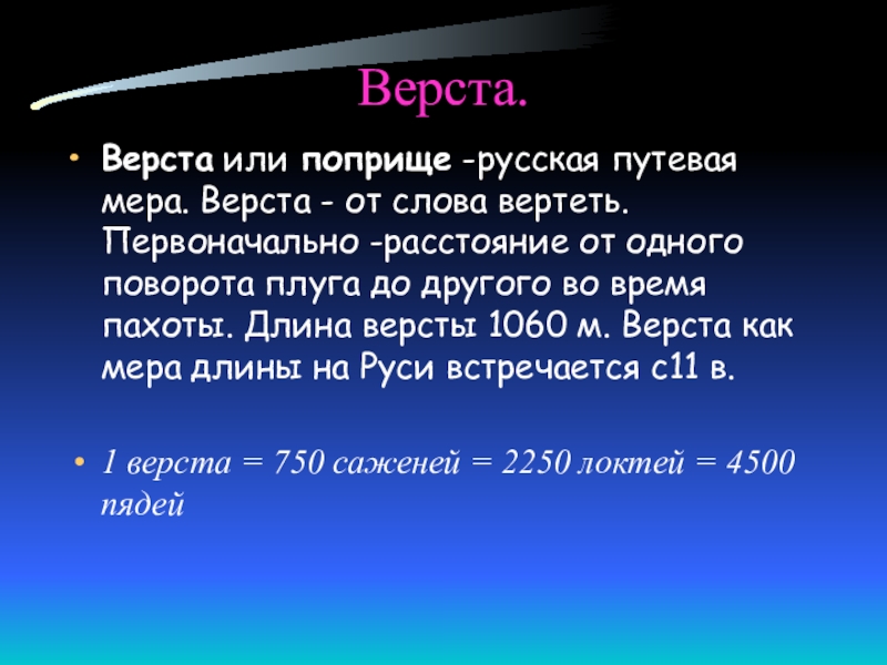 Первоначально -расстояние от одного поворота плуга до другого во время пахоты. Длина версты 1060 м. Верста как мера длины на Руси встречается с11 в.