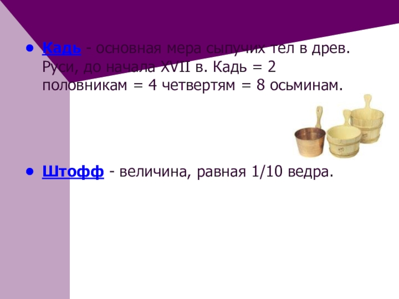Слайд 23Кадь - основная мера сыпучих тел в древ. Руси, до начала