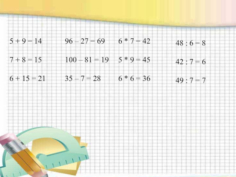 5 + 9 = 147 + 8 = 156 + 15 = 21 96 – 27 =