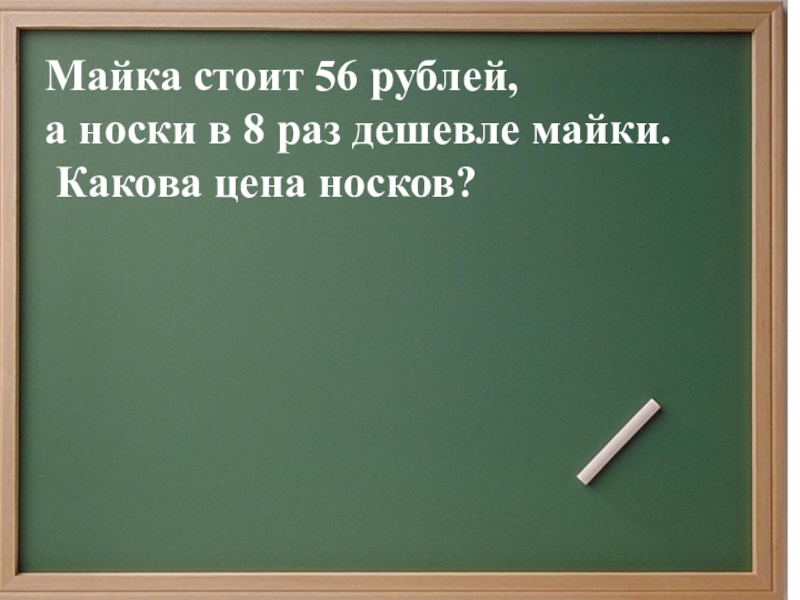 Майка стоит 56 рублей, а носки в 8 раз дешевле майки. Какова цена носков?
