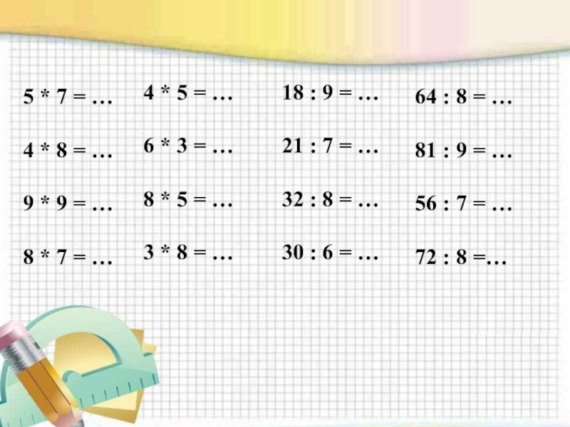 5 * 7 = …4 * 8 = …9 * 9 = …8 * 7 = …4 * 5 = …6 * 3 = …8 * 5 = …3 * 8 = …18 : 9