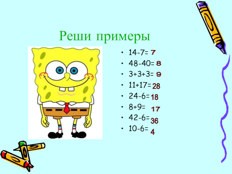 Реши примеры14-7=48-40=3+3+3=11+17=24-6=8+9=42-6=10-6=7 8 9 28 18 17 36 4