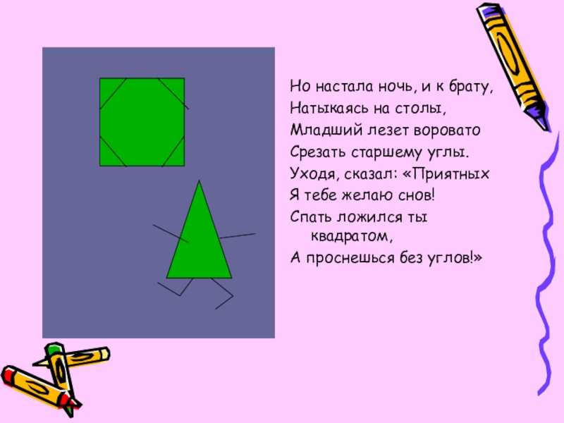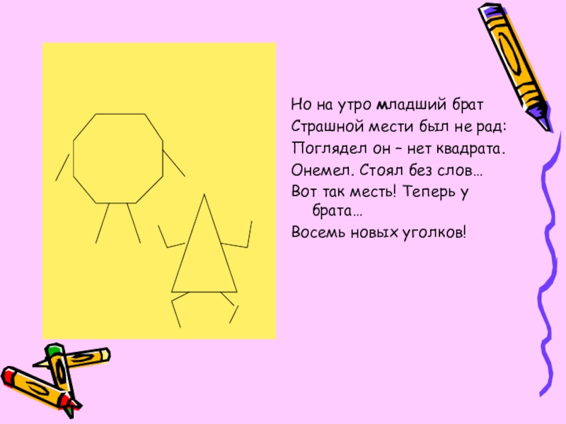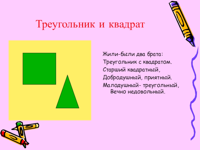 Треугольник и квадратЖили-были два брата:Треугольник с квадратом.Старший квадратный,Добродушный, приятный.Малодушный- треугольный, Вечно недовольный.