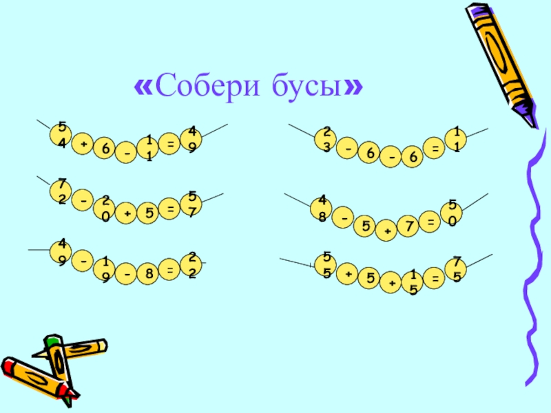 «Собери бусы»54+6-11=4972-20+5=5749-19-8=2223-6-6=1148-5+7=5055+5+15=75