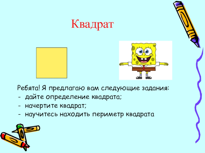 Квадрат Ребята! Я предлагаю вам следующие задания:дайте определение квадрата;начертите квадрат;научитесь находить периметр квадрата