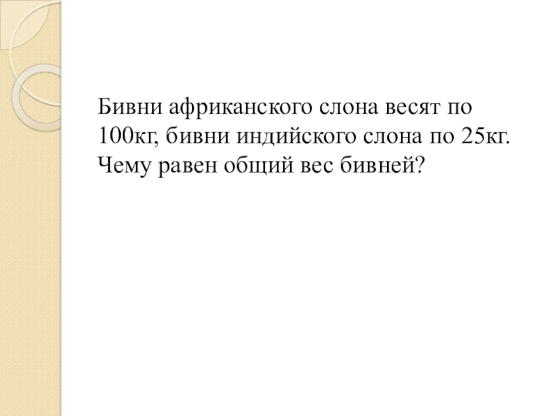Бивни африканского слона весят по 100кг, бивни индийского слона по 25кг. Чему равен общий вес бивней?