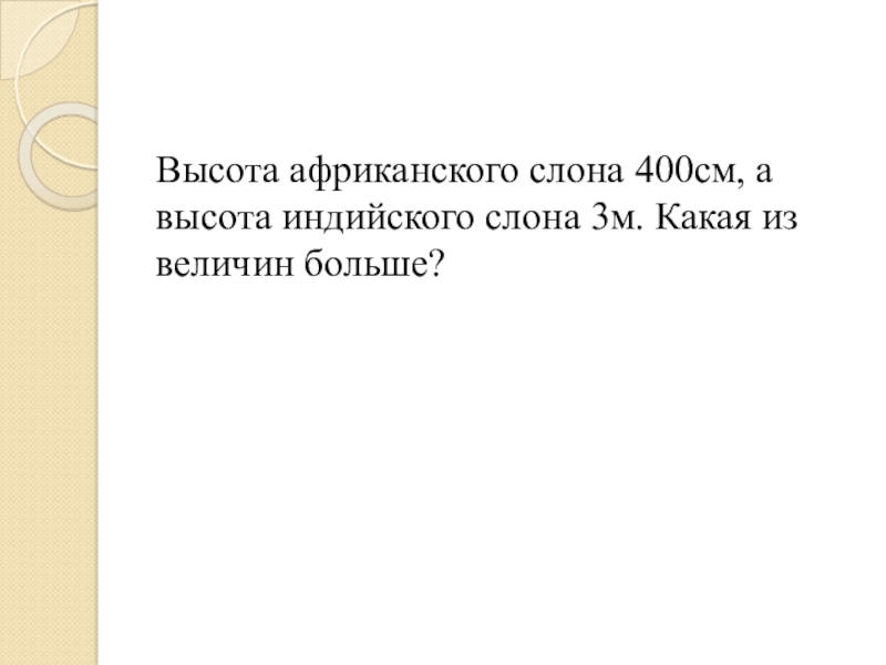 Слайд 7Высота африканского слона 400см, а высота индийского слона 3м. Какая из