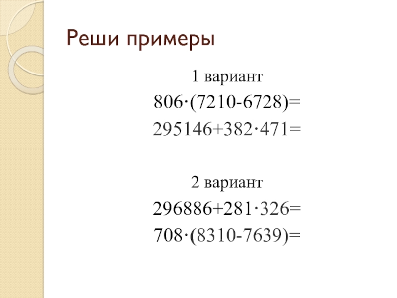 Реши примеры1 вариант  806·(7210-6728)=295146+382·471=2 вариант296886+281·326=708·(8310-7639)=