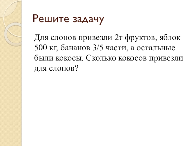 Решите задачуДля слонов привезли 2т фруктов, яблок 500 кг, бананов 3/5 части, а остальные были кокосы. Сколько