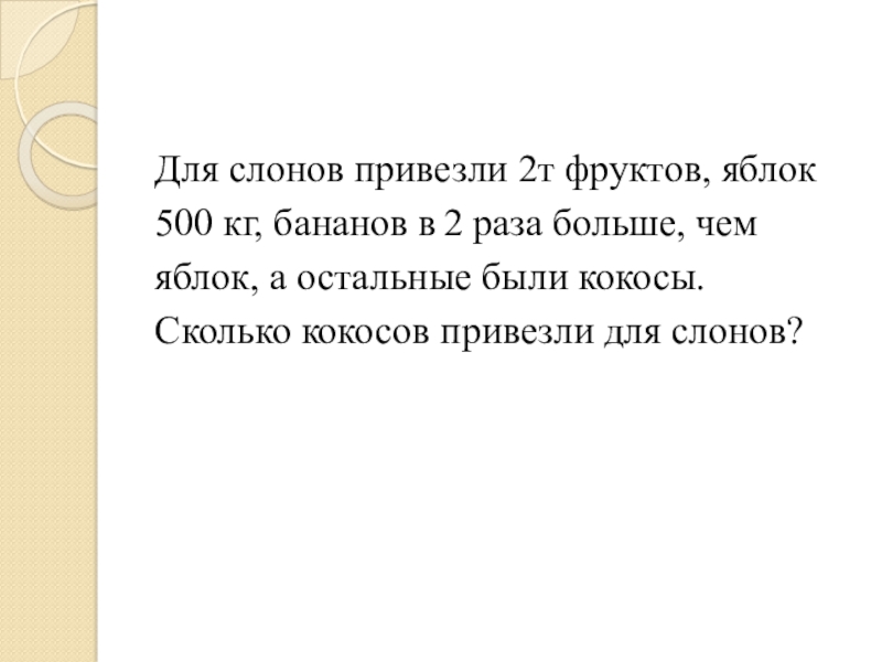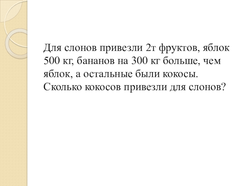 Слайд 12Для слонов привезли 2т фруктов, яблок 500 кг, бананов на 300