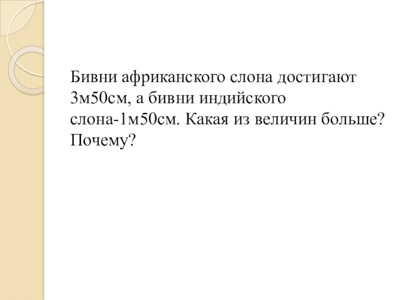 Бивни африканского слона достигают 3м50см, а бивни индийского слона-1м50см. Какая из величин больше? Почему?
