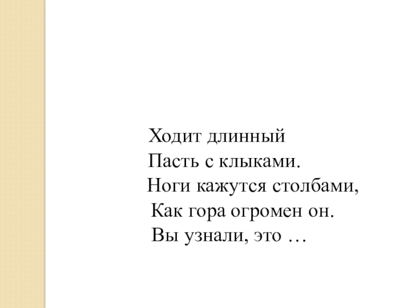 Ходит длинный Пасть с клыками. Ноги кажутся столбами, Как гора огромен он. Вы узнали, это …