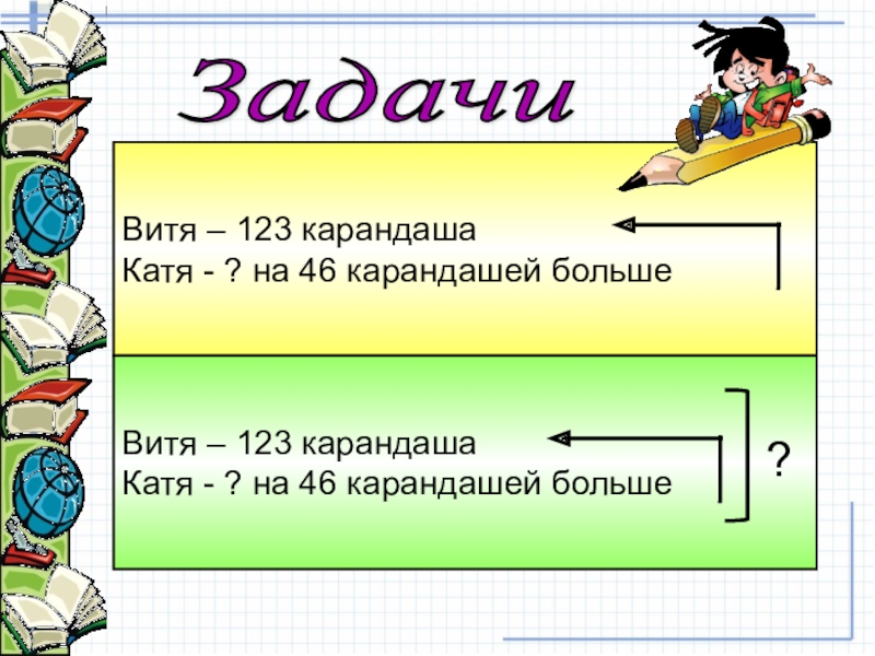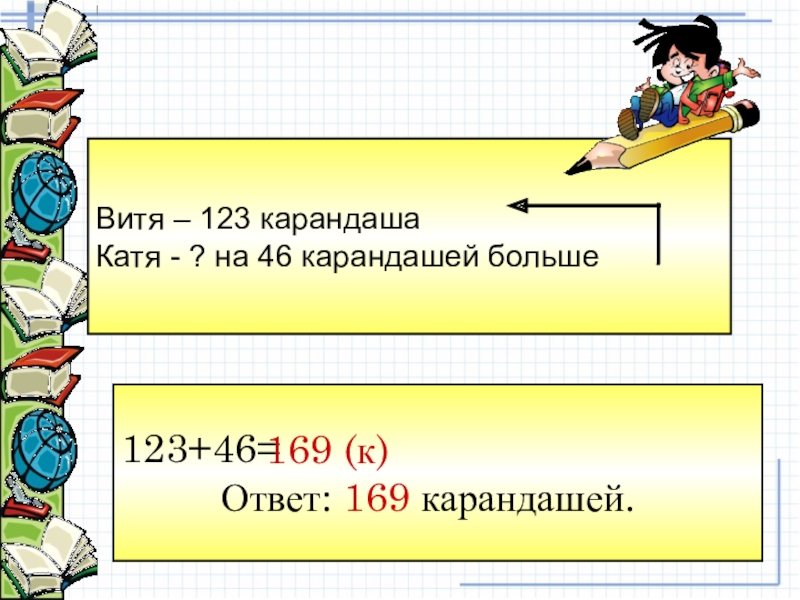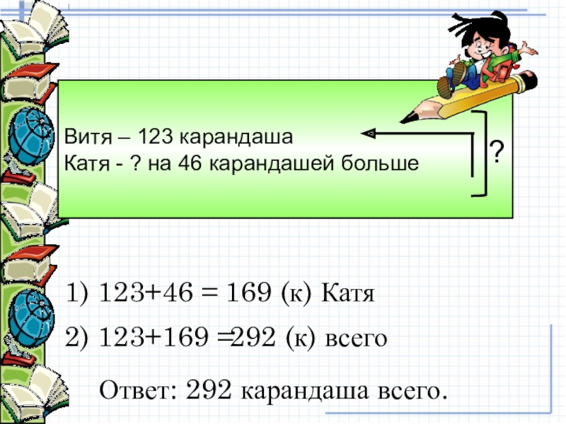 Витя – 123 карандашаКатя - ? на 46 карандашей больше?169 (к) Катя292 (к) всего1) 123+46 = 2)