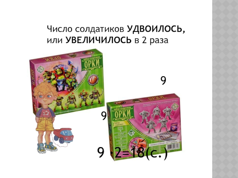 999 ·2=18(с.)Число солдатиков УДВОИЛОСЬ, или УВЕЛИЧИЛОСЬ в 2 раза