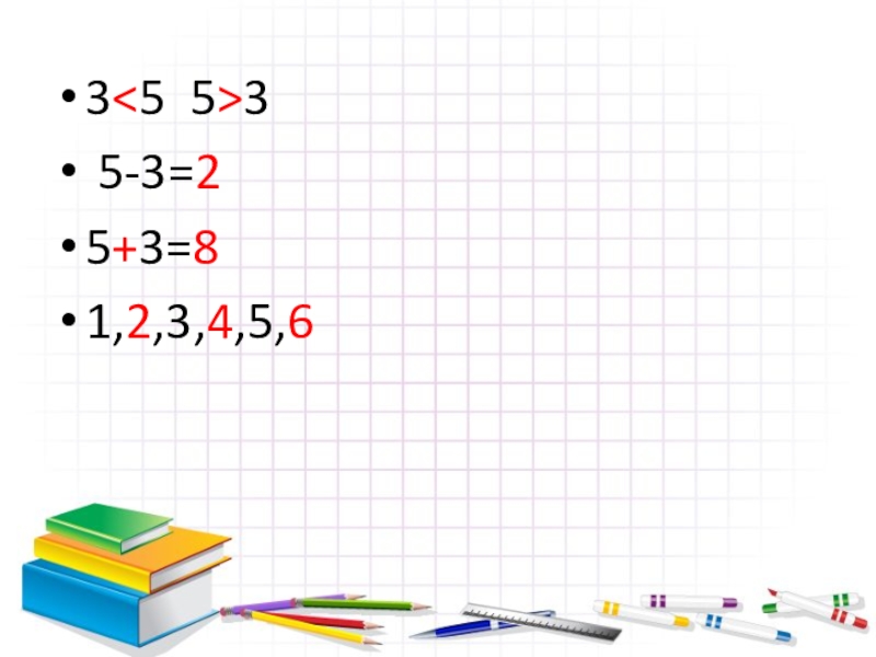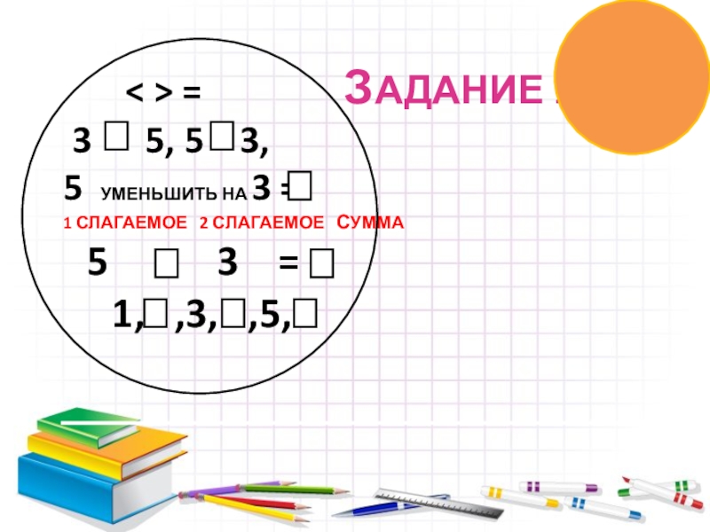ЗАДАНИЕ 1 3 5, 5 3, 5 УМЕНЬШИТЬ НА 3 = 1 СЛАГАЕМОЕ 2 СЛАГАЕМОЕ СУММА 5 3 = 1, ,3, ,5,