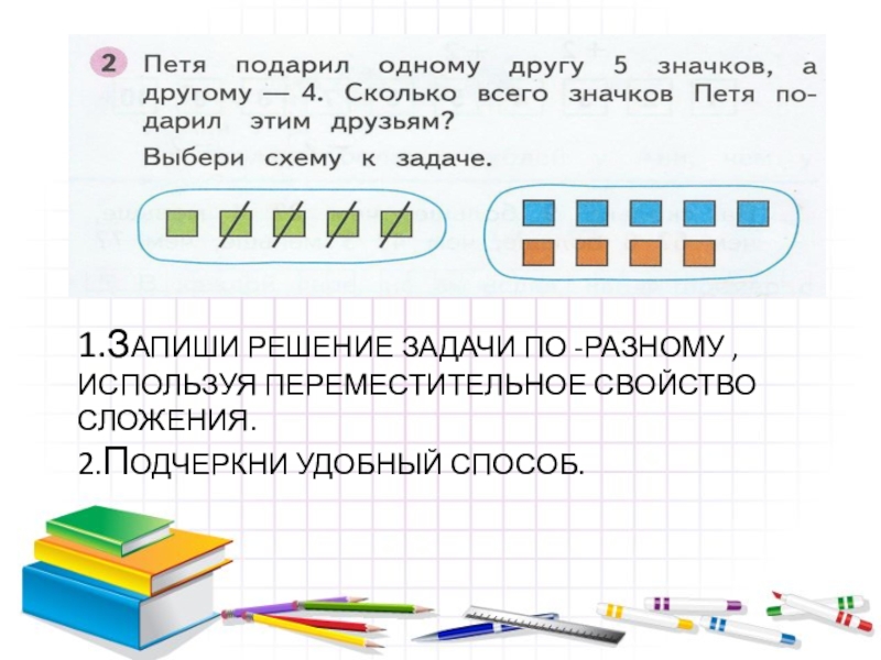 1.ЗАПИШИ РЕШЕНИЕ ЗАДАЧИ ПО -РАЗНОМУ , ИСПОЛЬЗУЯ ПЕРЕМЕСТИТЕЛЬНОЕ СВОЙСТВО СЛОЖЕНИЯ. 2.ПОДЧЕРКНИ УДОБНЫЙ СПОСОБ.