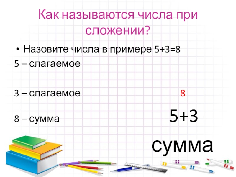 Как называются числа при сложении?Назовите числа в примере 5+3=85 – слагаемое 3 – слагаемое