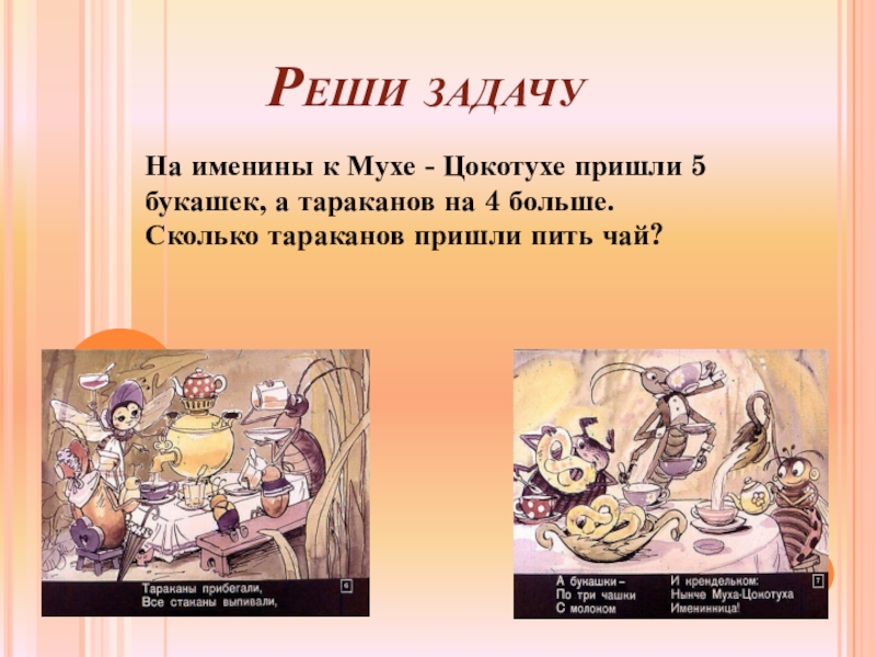 Реши задачуНа именины к Мухе - Цокотухе пришли 5 букашек, а тараканов на 4 больше. Сколько тараканов