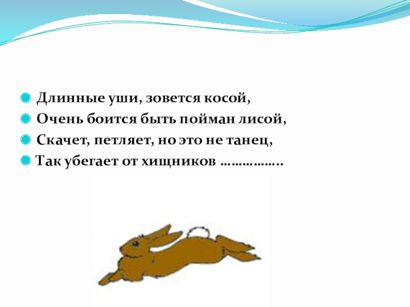 Длинные уши, зовется косой,Очень боится быть пойман лисой,Скачет, петляет, но это не танец,Так убегает от хищников ……………..
