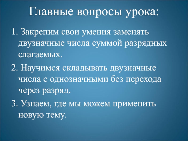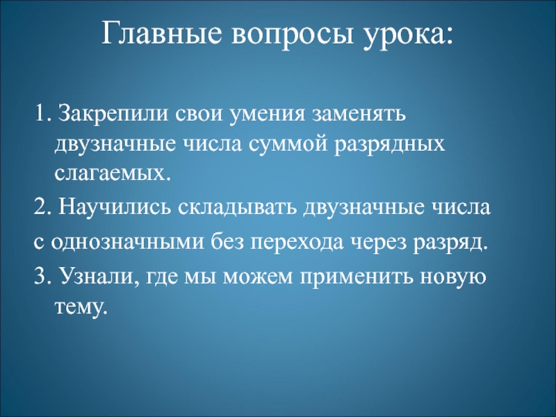 1. Закрепили свои умения заменять двузначные числа суммой разрядных