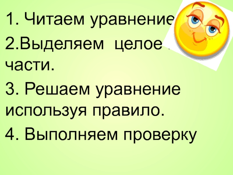 1. Читаем уравнение.2.Выделяем целое и части.3. Решаем уравнение используя правило.4. Выполняем проверку
