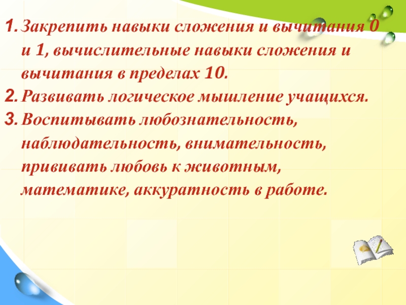 Слайд 3Закрепить навыки сложения и вычитания 0 и 1, вычислительные навыки сложения