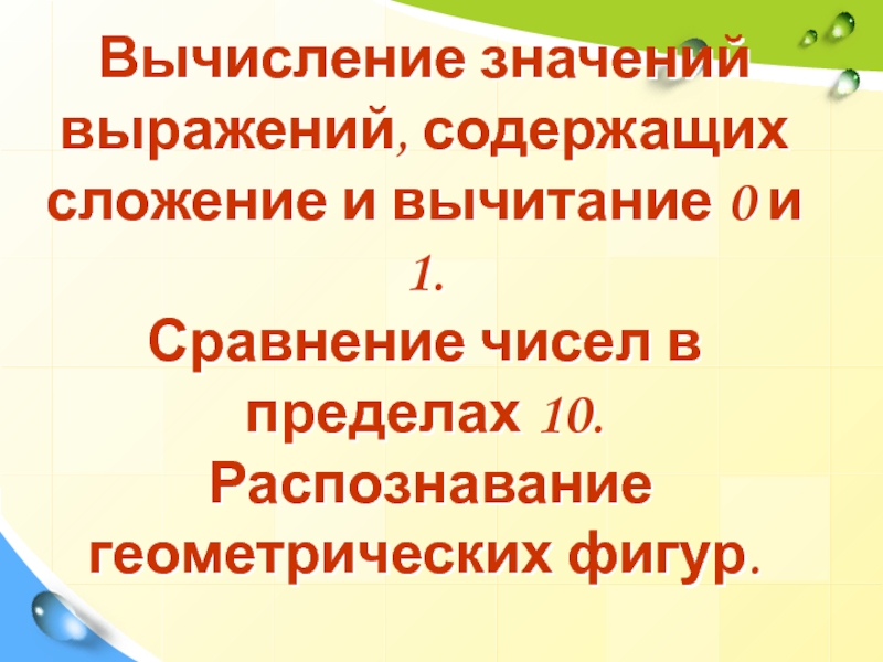 Презентация, доклад к уроку математики в 1 классе. Вычисление значений выражений, содержащих сложение и вычитание 0 и 1. Сравнение чисел в пределах 10. Распознавание геометрических фигур.