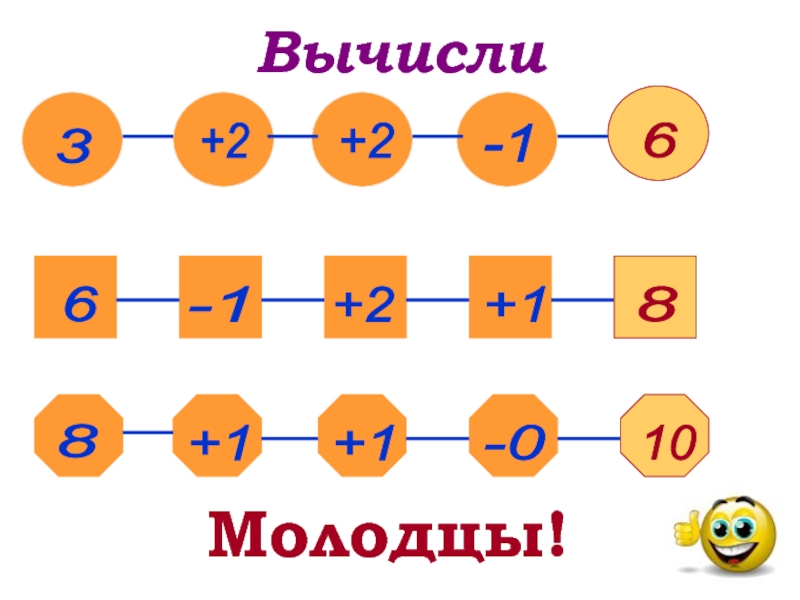 Вычисли3 +2 +2 -1 ? 6 -1 +2 +1 ? 8 6 8 +1 +1 -0 ? 10 Молодцы!