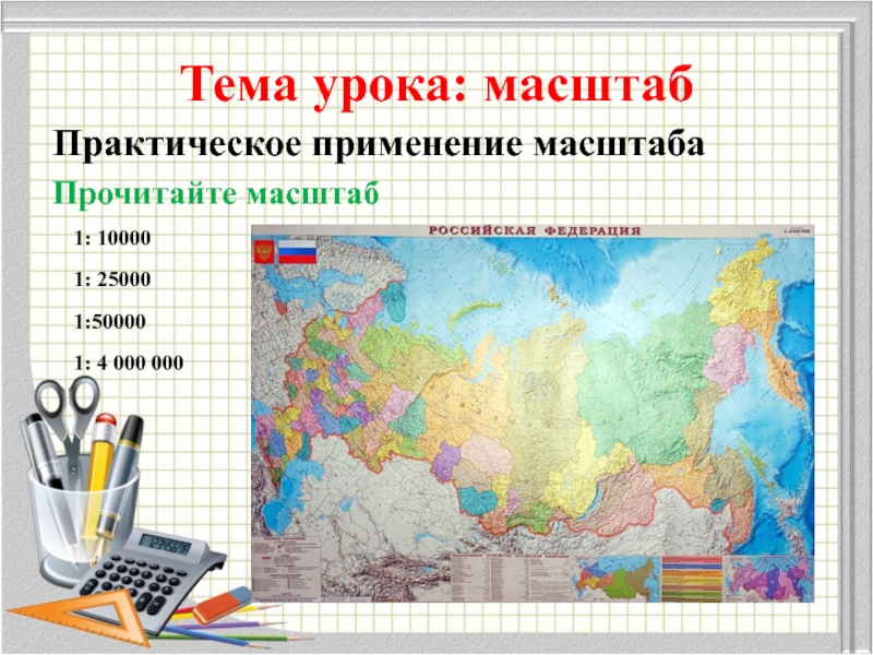 Тема урока: масштабПрактическое применение масштабаПрочитайте масштаб1: 10000 1: 250001:500001: 4 000 000