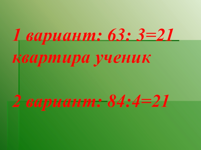 Слайд 11 1 вариант: 63: 3=21 квартира ученик 2 вариант: 84:4=21