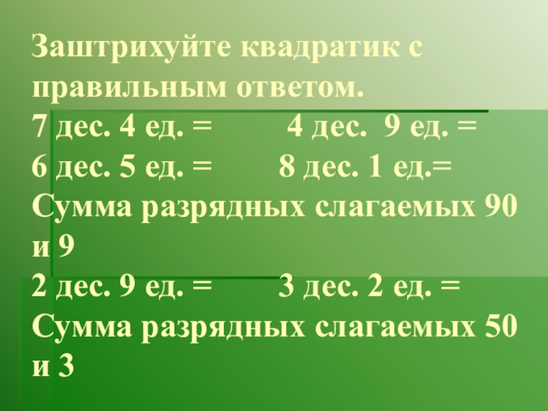 Заштрихуйте квадратик с правильным ответом. 7 дес. 4 ед. = 4 дес. 9 ед. = 6 дес. 5 ед. = 8 дес. 1 ед.= Сумма разрядных слагаемых 90 и