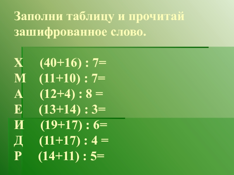 Слайд 4 Заполни таблицу и прочитай зашифрованное слово. Х (40+16) : 7= М