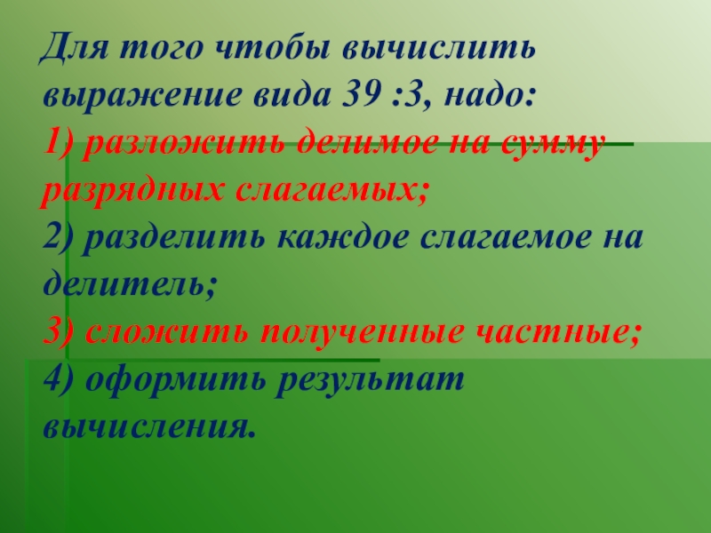 Для того чтобы вычислить выражение вида 39 :3, надо:  1) разложить делимое на сумму разрядных слагаемых;