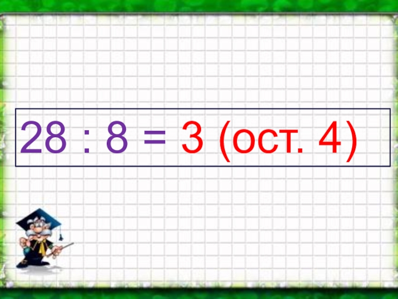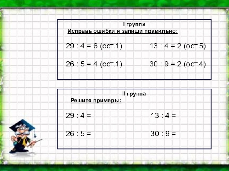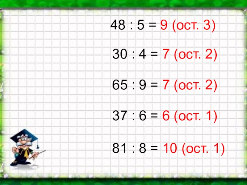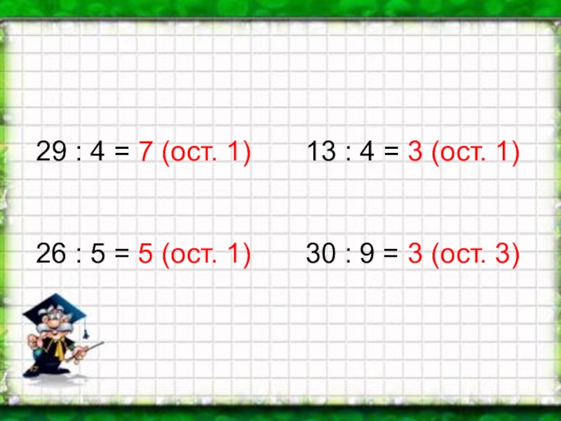 26 : 5 = 4 (ост.1) 30 : 9 = 2 (ост.4)