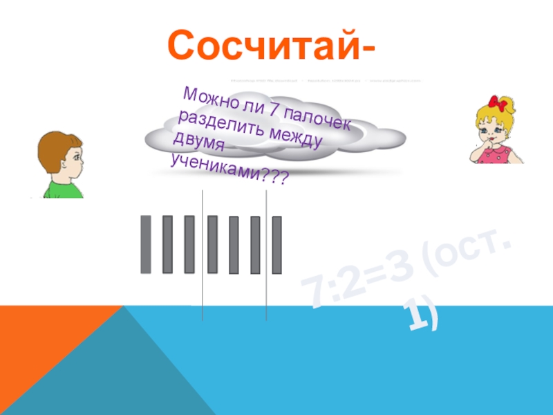 Сосчитай-каМожно ли 7 палочек разделить между двумя учениками???7:2=3 (ост. 1)