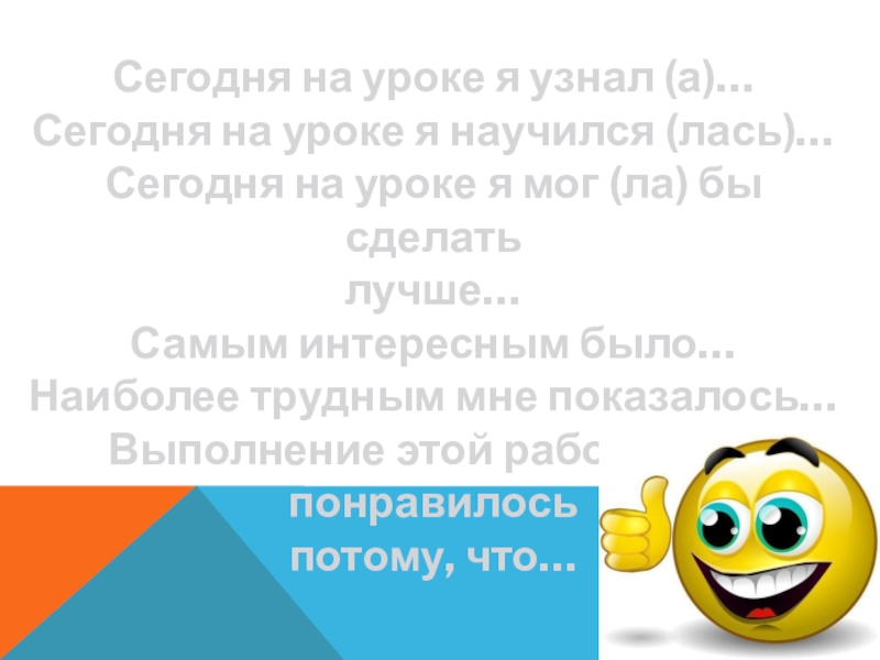 Сегодня на уроке я узнал (а)…Сегодня на уроке я научился (лась)…Сегодня на уроке я мог (ла) бы